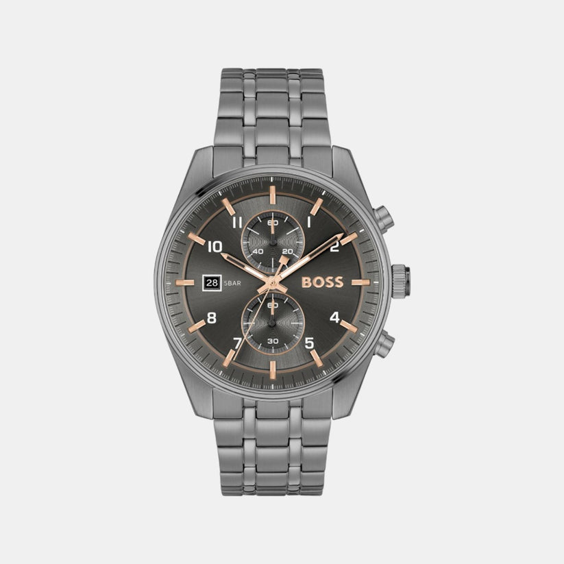 Get hold of this stylish men's analog watch from the Skytraveller collection by BOSS and make a distinct style statement. Secured by a mineral glass, the grey round dial is housed in a 44 mm case. It exhibits chronograph. The stainless steel strap showcases a grey hue that uplifts the look of the watch. Moreover, it is fitted with a push-button clasp to ensure a secure fit on the wrist.