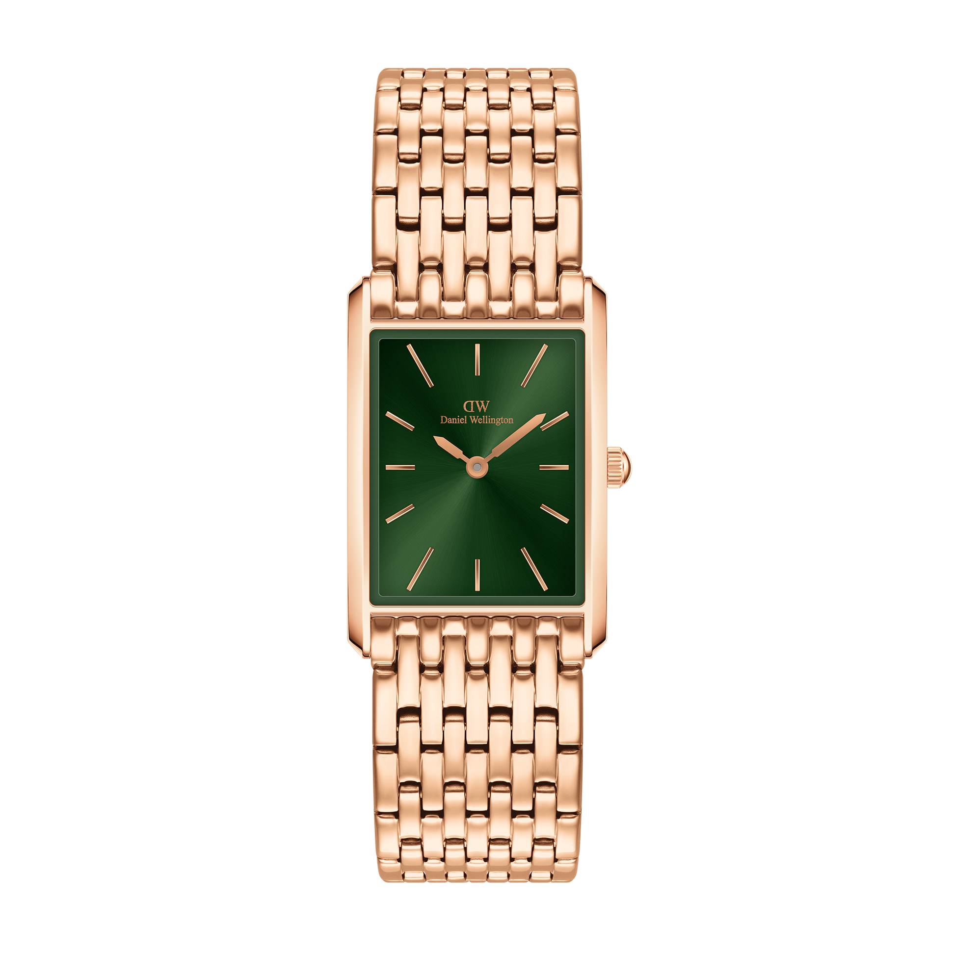 With sleek geometric edges and two sizes to choose from, our Bound collection brings perfect symmetry to your wrist. The curved rectangular case of this rose gold watch matches the exact width of its 9-link strap—giving you a seamlessly integrated emerald sunray dial.