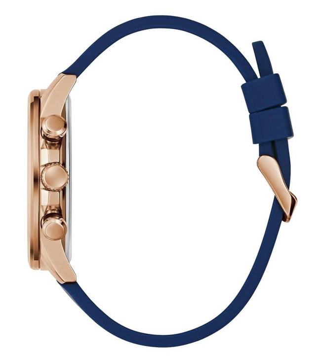 Style and performance perfectly combine together to form this men's analog watch that is brought to you by the Walker collection by Guess. Operated by a quartz movement and safeguarded by a mineral glass, the blue round dial is encased in a 44 mm case. It features chronograph. The silicon strap comes in a blue hue that further elevates the look of the timepiece. Moreover, it is fitted with a buckle clasp to ensure a secure fit on the wrist.