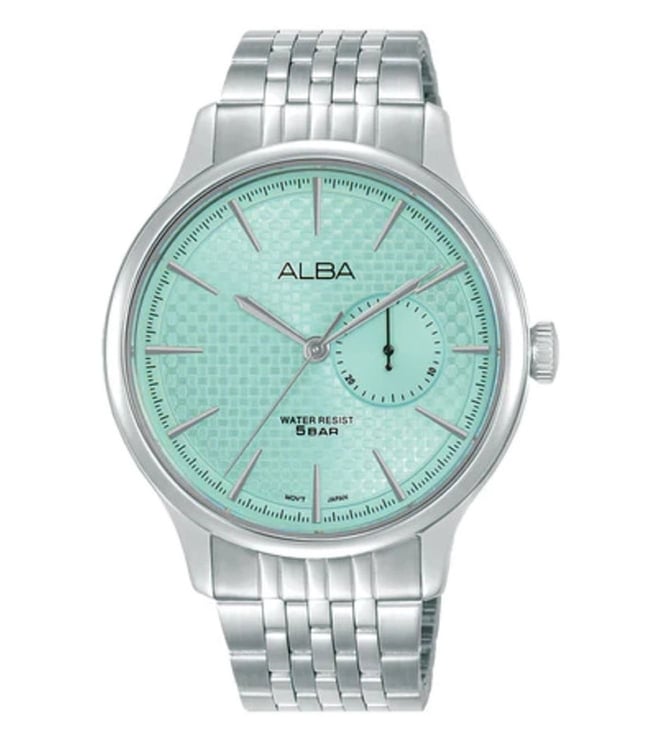 A refreshing 41mm mens watch featuring a serene, ice-mint colored dial encased in polished stainless steel. Its powered by the reliable VH65 quartz movement, offers simple three-hand timekeeping with date, and features a sleek stainless steel wrap bracelet. The minimalistic design is paired with mineral crystal and is water-resistant up to 50m, making it a classy yet practical everyday timepiece.