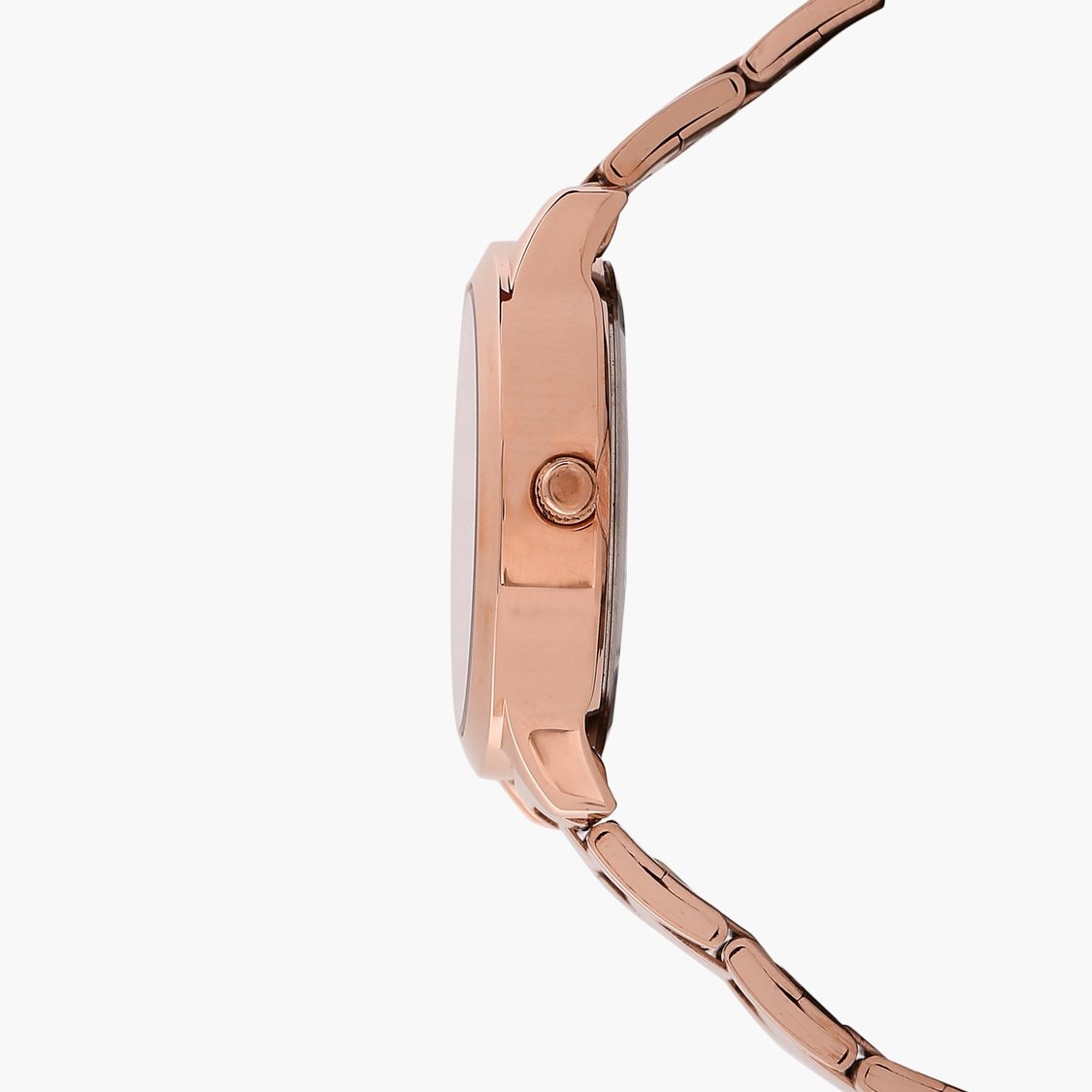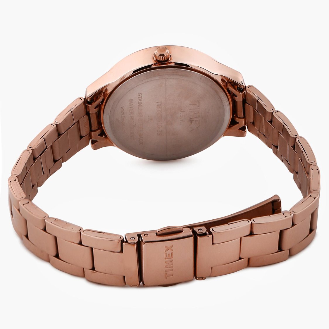 Enhance your style quotient by wearing this women's analog watch from Timex. Its stainless steel strap exudes a rose gold hue that accentuates the look of the watch. Operated by a quartz movement, the round dial showcases plain three hands, hour markings at five-minute intervals, butterfly motifs and a crown for time adjustment. Furthermore, it is complemented with a push-button clasp that ensures a secure fit on the wrist.