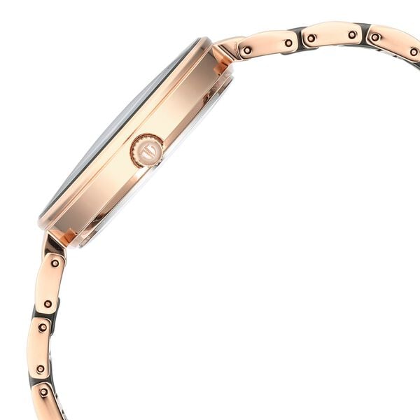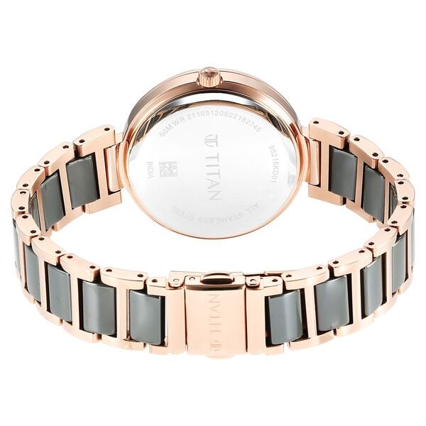 Blending functionality and style, this women's analog watch from the Purple collection by Titan is a must-have. Its blue round dial is housed in an elegant case. It displays plain three hands functional on a quartz movement and a crown for time adjustment. Its ceramic bracelet vaunts a green hue that enhances the look of the watch. Moreover, it is fitted with a push-button clasp to ensure a secure fit on the wrist.